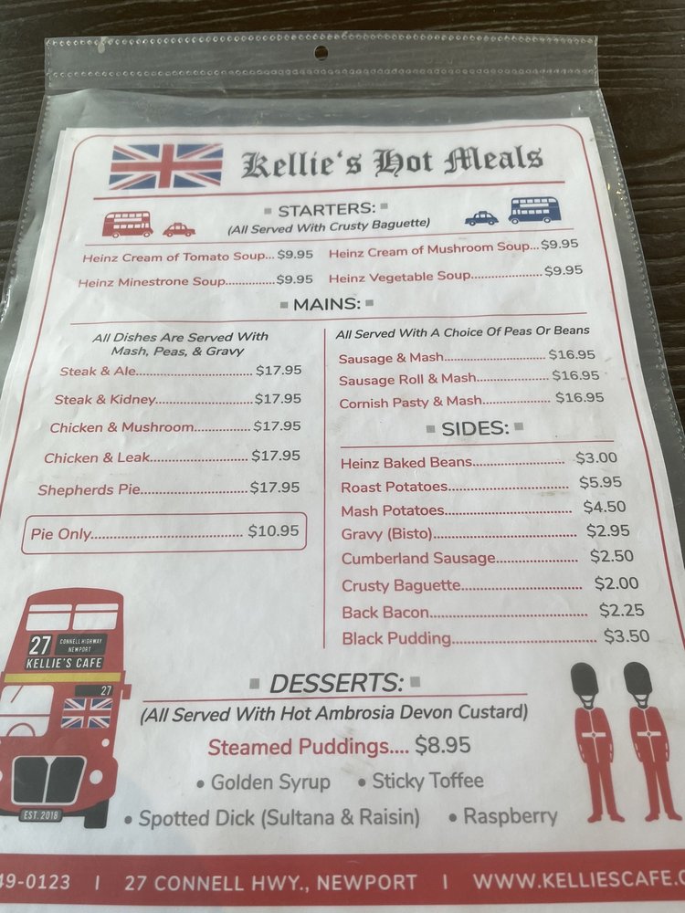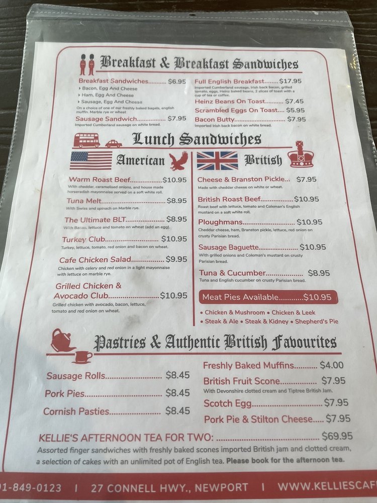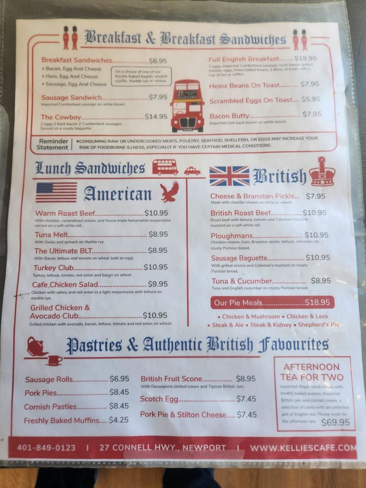 Introducing the menu at Kellie’s Cafe, a charming spot in Newport, RI, offering a variety of American and British breakfast and lunch options. With a cozy atmosphere and friendly service, customers rave about the authentic and delicious food. From classic American breakfast sandwiches to British favorites like the Full Monty and bacon butty, the menu caters to a diverse palate. The warm roast beef sandwich and grilled chicken and avocado club sandwich are highlights, showcasing the quality and freshness of ingredients. Pair your meal with a cup of tea or coffee for the perfect dining experience. Don't miss out on the homemade scones and sausage rolls, highly praised by patrons. Kellie and her husband create a warm and welcoming environment, making every visit a delightful experience.